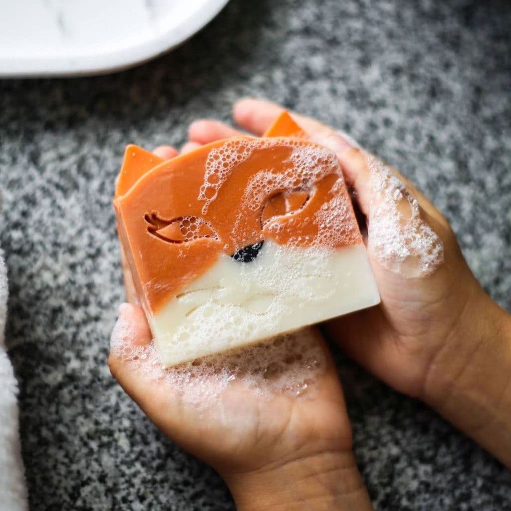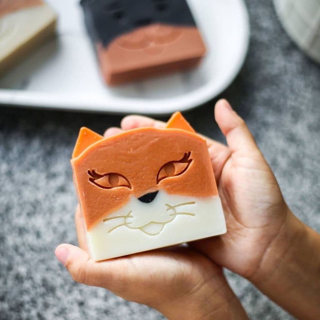 Mýdlo je zabalené ve veselé kartonové krabičce, která z něj dělá krásný dárek.