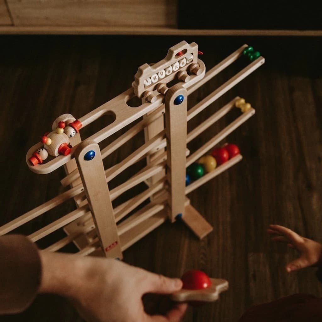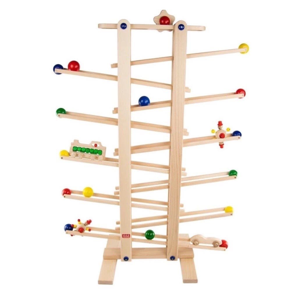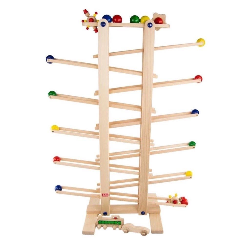 Dřevěná kuličková dráha je vyrobena ekologicky, testována podle bezpečnostních norem CE EN 71 a opatřena speciálními barvami vhodnými pro děti.