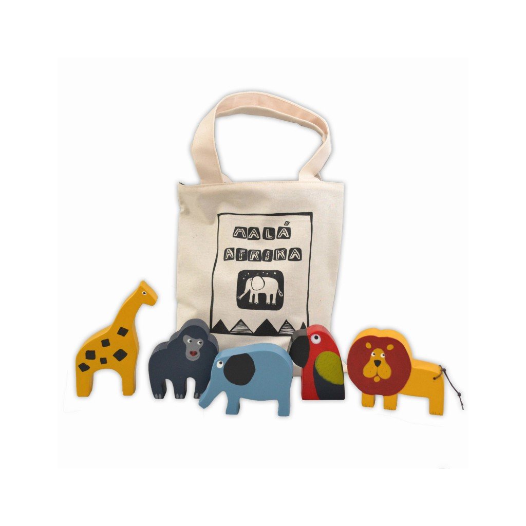 Rozměry tašky jsou 20 x 24 cm, rozměry zvířátek od 8 do 15 cm. Hračky jsou vyřezané z lipového dřeva, ručně namalované akrylovými barvami a navoskované.