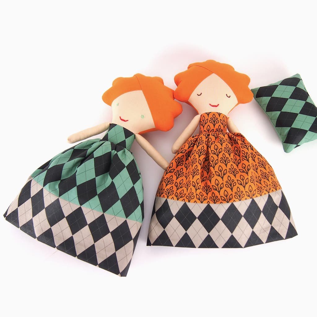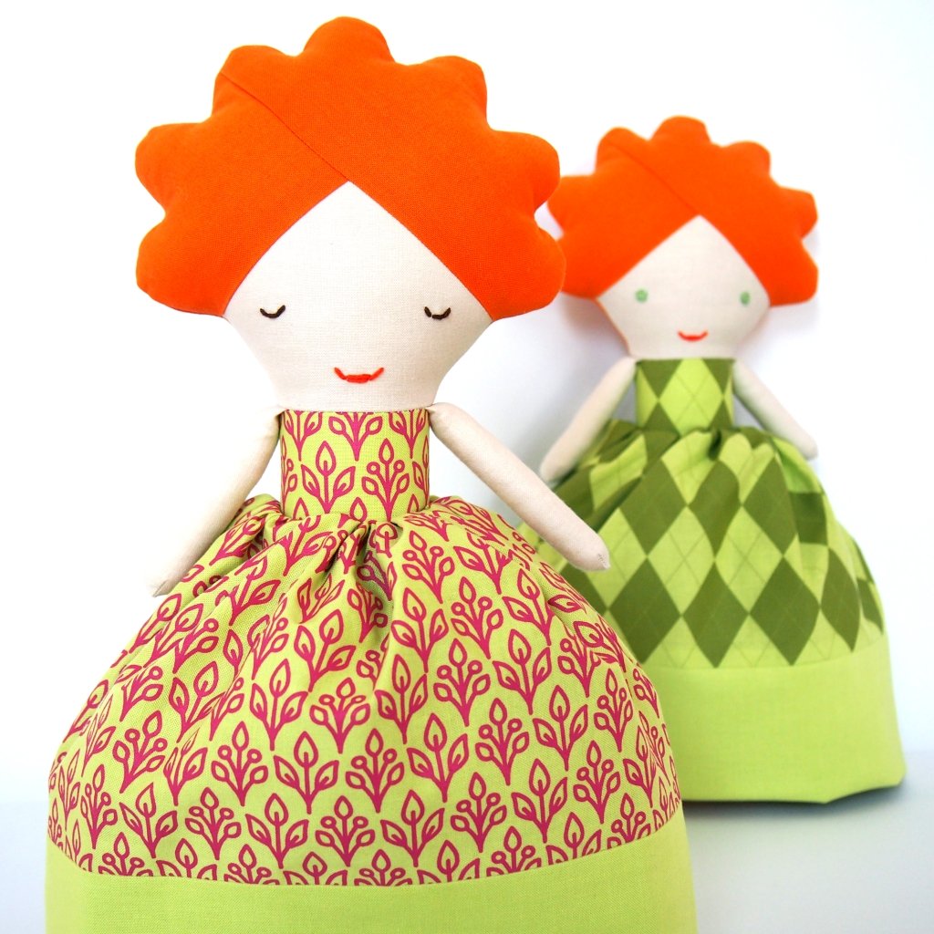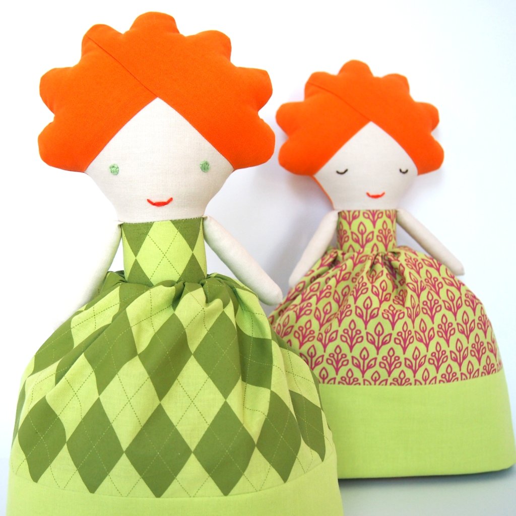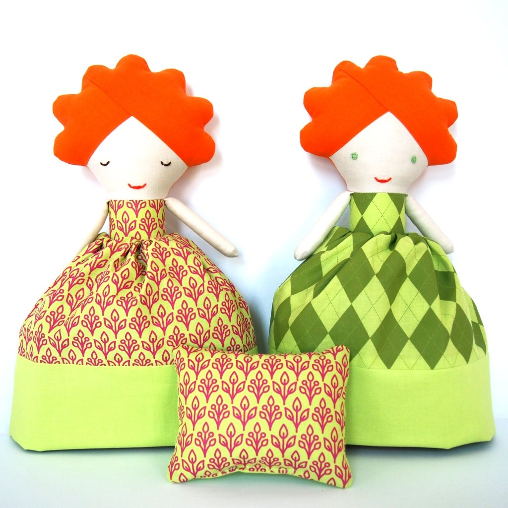 Panenky jsou ušité z autorské látky Ivany Holbové vyrobené sítotiskem na látky české výroby.