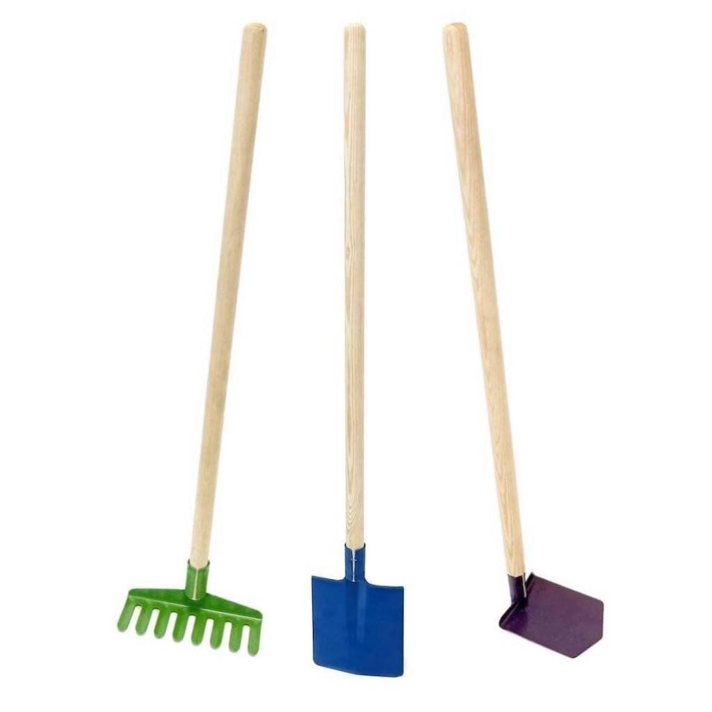 Set obsahuje kovové hrabě, rýč a motyčku.